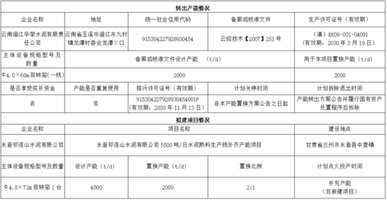 根據(jù)公示,云南澄江華榮水泥有限責(zé)任公司2條2000t/d水泥熟料線產(chǎn)能,分別用于永登祁連山水泥有限公司和天水祁連山水泥有限公司5500t/d水泥熟料生產(chǎn)線補(bǔ)齊產(chǎn)能項(xiàng)目,置換比例均為2:1,該生產(chǎn)線下計(jì)劃產(chǎn)能轉(zhuǎn)出方案公告并履行國有資產(chǎn)處置程序后拆除。