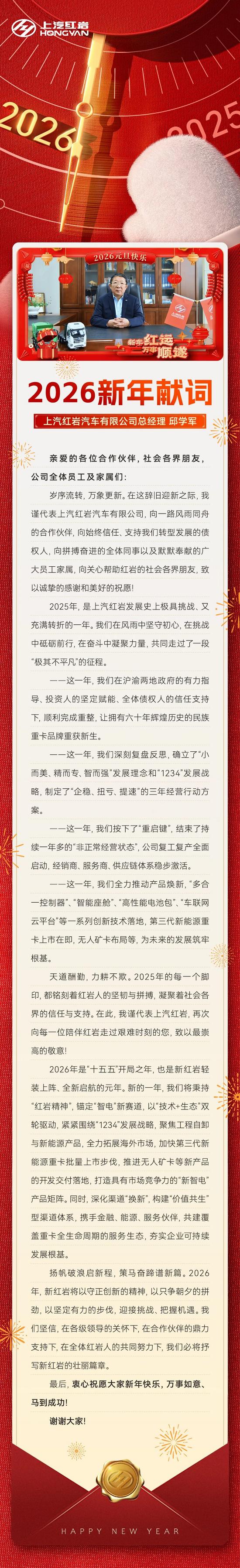 上汽紅巖總經(jīng)理邱學(xué)軍2026新年獻(xiàn)詞