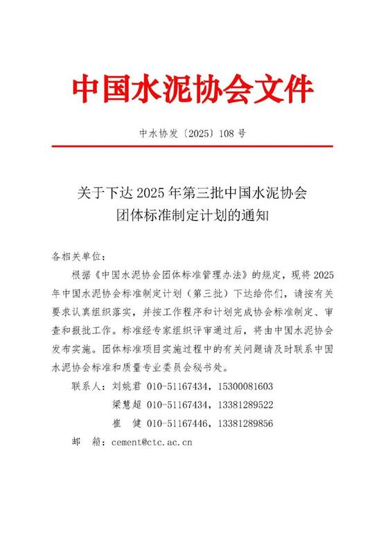 關(guān)于下達2025年第三批中國水泥協(xié)會團體標(biāo)準制定計劃的通知