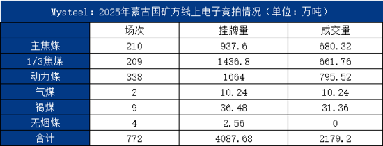 我的鋼鐵網(wǎng):2025年12月,蒙煤電子競拍市場整體表現(xiàn)為供需失衡、流拍率攀升和價格波動加劇,成交率低位徘徊且價格下行趨勢明顯。核心驅(qū)動因素包括鋼廠需求不足、供應(yīng)過剩及期貨市場波動。據(jù)Mysteel統(tǒng)計(jì)數(shù)據(jù)顯示,2025年蒙古國礦方掛牌772場合計(jì)4087.68萬噸,其中成交369場,合計(jì)2179.2萬噸,成交占比53.31%。