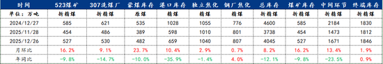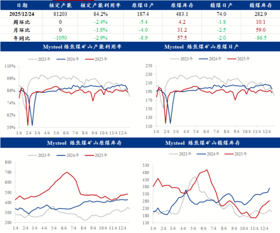 元旦后預(yù)計(jì)煤礦會有復(fù)產(chǎn):我網(wǎng)調(diào)研結(jié)果顯示,截至2025年12月24日,Mysteel統(tǒng)計(jì)523家煉焦煤礦山樣本核定產(chǎn)能利用率為84.2%,月環(huán)比下降1.8個(gè)百分點(diǎn)。原煤日均產(chǎn)量187.4萬噸,月環(huán)比下降3.9萬噸,原煤庫存483.1萬噸,月環(huán)比增加31.2萬噸 ,精煤日均產(chǎn)量74萬噸,月環(huán)比下降2.4萬噸,精煤庫存282.9萬噸,月環(huán)比增加59萬噸。從調(diào)研數(shù)據(jù)來看,煤礦12月份產(chǎn)量下降主要是因?yàn)槟甑撞糠置旱V完成任務(wù)主動(dòng)控產(chǎn),而元旦后這些煤礦又都會恢復(fù)生產(chǎn),所以預(yù)計(jì)1月煤礦產(chǎn)量會有所回升。