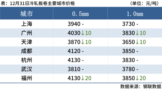 冷軋板卷:12月31日,全國24個主要城市1.0mm冷卷均價3847元/噸,較上個交易日6元/噸。目前北方市場已經(jīng)進(jìn)入需求淡季,現(xiàn)貨市場商家為保成交只能降價銷售,議價空間有增加,終端客戶采購較為謹(jǐn)慎,市場整體成交氛圍一般,北方區(qū)域大戶日度成交800噸。元旦節(jié)前貿(mào)易商降庫意愿明顯,對后市行情持謹(jǐn)慎觀望心態(tài)為主,采購意愿不強(qiáng),預(yù)計短期冷軋價格或?qū)⒊掷m(xù)窄幅震蕩運(yùn)行為主。