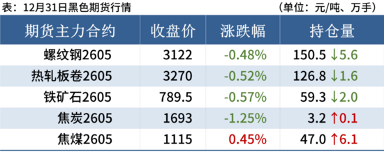 焦炭:12月31日焦炭價格偏弱運(yùn)行,河北、山東主流鋼廠發(fā)文針對焦炭采購價格進(jìn)行第四輪下調(diào),濕熄降幅50元/噸,干熄降幅55元/噸,2026年1月1日0時起執(zhí)行。現(xiàn)貨方面原料價格情緒偏弱,采購情緒較差,流拍率偏高,整體仍有降價空間。下游鋼廠方面,繼續(xù)保持對于焦炭的提降預(yù)期,第四輪落地后,預(yù)計將繼續(xù)提降第五輪,具體提降時間未定,預(yù)計近期焦炭價格偏弱運(yùn)行。