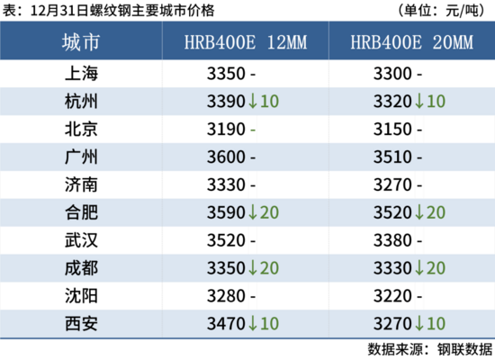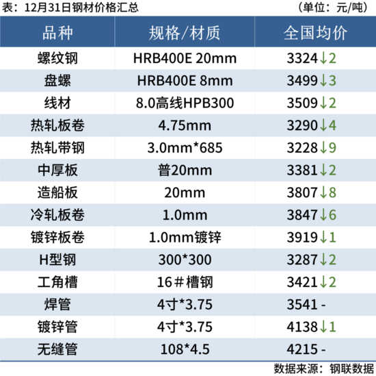 螺紋鋼:12月31日,全國31個主要城市20mm三級抗震螺紋鋼均價3324元/噸,較上個交易日元/噸。當(dāng)前市場庫存維持下降態(tài)勢,但進(jìn)入一月份,終端需求減弱,鋼廠發(fā)貨量勢必增加,因此當(dāng)前商家操作仍以出貨為主,預(yù)計短期國內(nèi)建筑鋼材價格或?qū)⒕S持窄幅震蕩運(yùn)行態(tài)勢。