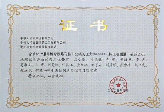 巢馬城際鐵路控制性工程馬鞍山公鐵長江大橋憑借其卓越的測繪地理信息技術(shù)應(yīng)用與工程實踐,榮獲2025年度國家測繪地理信息產(chǎn)業(yè)優(yōu)秀工程金獎。