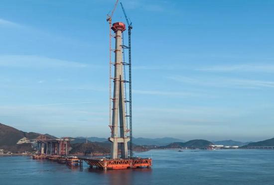 12月30日,甬舟鐵路西堠門公鐵大橋主塔封頂。
