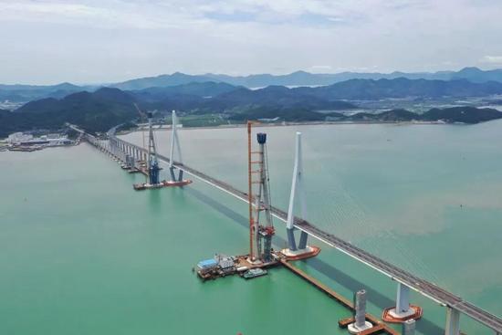 6月16日,寧波至象山市域(郊)鐵路象山港跨海大橋南北兩座主塔雙雙封頂。
