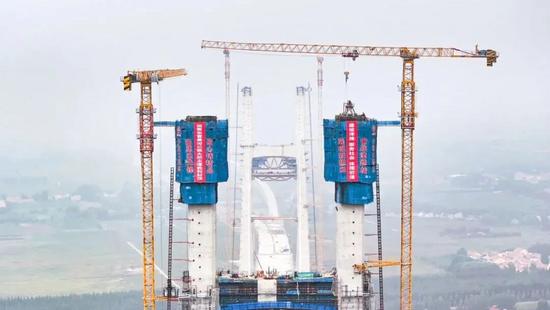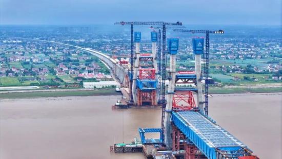 9月29日,滬渝蓉高鐵崇啟公鐵長江大橋雙主塔同日封頂。