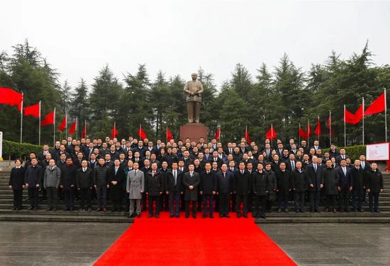 莊嚴(yán)的銅像廣場上,松柏蒼翠。隨著《獻(xiàn)花曲》緩緩奏響,全體高管列隊(duì)肅立,緩步上前,向一代偉人敬獻(xiàn)花籃,并深深三鞠躬,寄托無盡緬懷與深切崇敬。
