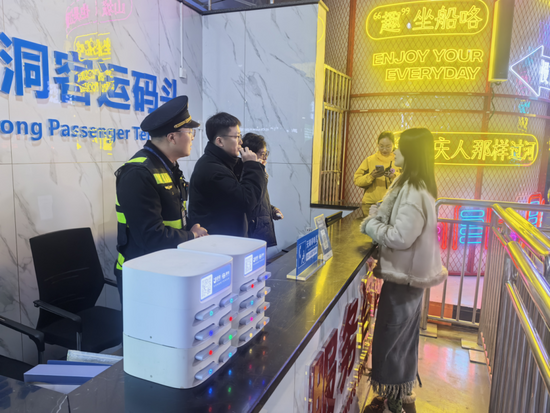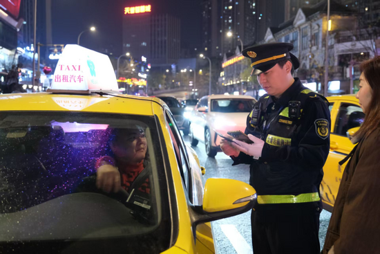 在南岸區(qū)長嘉匯,執(zhí)法人員認(rèn)真核查出租車駕駛員身份信息,疏導(dǎo)現(xiàn)場交通,提醒市民游客跨年夜出行注意事項。