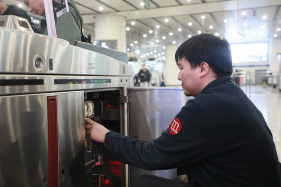 京港地鐵4號線通號維修人員對售檢票設(shè)備進行巡視。