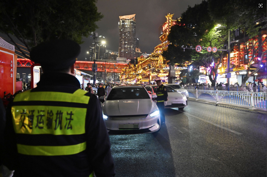 在洪崖洞景區(qū),執(zhí)勤的執(zhí)法人員背對絢爛,面向道路,用責(zé)任與擔(dān)當(dāng)守護著這座城市的平安脈搏。