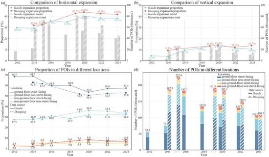 基于高德與大眾點評數(shù)據(jù)的北京商業(yè)設(shè)施水平與垂直擴(kuò)張的時空特征結(jié)果顯示,盡管兩平臺數(shù)據(jù)存在差異,但均呈現(xiàn)2012-2020年持續(xù)水平及垂直擴(kuò)張、2020-2022年有所波動、2022-2024年企穩(wěn)回升的總體趨勢(圖6)。研究發(fā)現(xiàn):商業(yè)設(shè)施水平擴(kuò)張規(guī)模更高,約為垂直擴(kuò)張的三倍;疫情期間沿街底商韌性更強(qiáng),而疫情后街區(qū)內(nèi)部與非底商店鋪占比有所回升;高德數(shù)據(jù)顯示疫情后非沿街底商店鋪比例上升,大眾點評則顯示非底商店鋪復(fù)蘇更顯著,反映出平臺記錄偏好對商業(yè)空間認(rèn)知的影響。