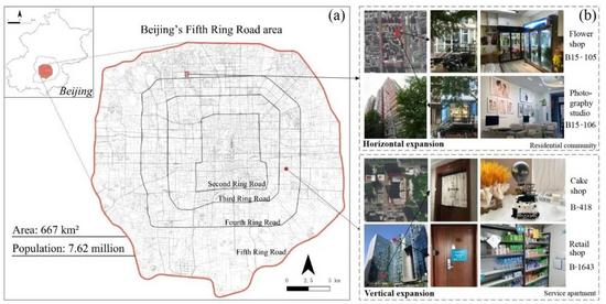 圖1:研究區(qū)域(北京五環(huán)內(nèi))(a)及傳統(tǒng)沿街底商類店鋪的水平-垂直擴(kuò)張示例(住宅社區(qū)內(nèi)的花店及攝影工作室;服務(wù)式公寓內(nèi)的蛋糕店及零售店)