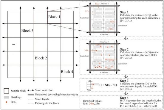 圖3 水平擴(kuò)張指標(biāo)(HoriEI)計算方法示意圖(20米臨街閾值法)