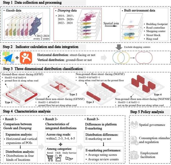 該研究創(chuàng)新性地提出“水平-垂直擴(kuò)張矩陣”分析框架,整合2012-2024年高德地圖與大眾點評多源大數(shù)據(jù),系統(tǒng)揭示數(shù)字時代城市商業(yè)設(shè)施的三維空間重構(gòu)動態(tài)特征。研究以北京五環(huán)內(nèi)為研究區(qū)域,通過159萬個傳統(tǒng)依賴于沿街底商的零售、餐飲與日常服務(wù)類商業(yè)POI數(shù)據(jù)的時空分析,發(fā)現(xiàn)傳統(tǒng)沿街底商店鋪占比持續(xù)下降但疫情期間展現(xiàn)出較高韌性;而非沿街底商則穩(wěn)步增長,沿街非底商及非沿街非底商店鋪盡管在疫情期間經(jīng)歷了短暫下降,但整體保持增長態(tài)勢。從空間上看,沿街底商的比例隨著距城市中心距離的增加而減少,而非底商店鋪則集中在二環(huán)至四環(huán)之間。日常服務(wù)相較于零售及餐飲而言更傾向于非傳統(tǒng)沿街底商的區(qū)域,此特征在疫情后更加明顯。值得注意的是,平臺對比顯示出了不同的記錄模式:高德地圖記錄了更多的沿街底商店鋪,而大眾點評網(wǎng)則記錄了更高比例的水平或垂直擴(kuò)張的店鋪,且垂直擴(kuò)張店鋪的在線評分和評論數(shù)量更高,這表明數(shù)字平臺的電子口碑可能有助于緩解物理空間中的可視性限制。此外,文中還討論了可能促進(jìn)商業(yè)設(shè)施三維空間重構(gòu)的國家和地方層面的相關(guān)政策。這些研究發(fā)現(xiàn)為數(shù)字時代的城市空間精細(xì)化治理與小微企業(yè)發(fā)展提供了全新視角。