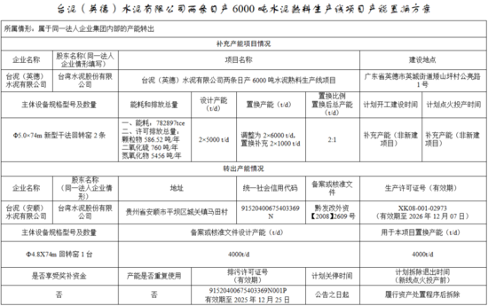 臺泥(英德)水泥有限公司兩條5000t/d水泥熟料線產(chǎn)能調(diào)整為兩條6000 t/d,置換補充產(chǎn)能均為1000t/d,置換比例均為2:1。臺泥(安順)水泥有限公司一條4000t/d水泥熟料線用于本項目置換產(chǎn)能,計劃履行資產(chǎn)處置程序后拆除。