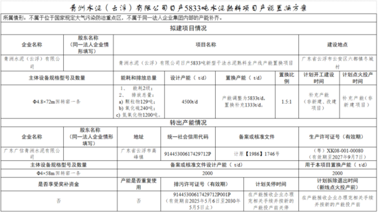 青洲水泥(云?。┯邢薰疽粭l4500t/d水泥熟料線產(chǎn)能調(diào)整為5833t/d,置換補充產(chǎn)能1333t/d,置換比例為1.5:1。廣東廣信青洲水泥有限公司一條2000t/d水泥熟料線用于本項目置換產(chǎn)能,計劃在產(chǎn)能接收企業(yè)辦理完相關(guān)手續(xù)并按新的產(chǎn)能投產(chǎn)前拆除退出。