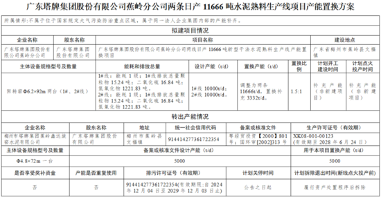 根據(jù)公告,廣東塔牌集團股份有限公司蕉嶺分公司兩線日產(chǎn)11666噸新型干法水泥熟料生產(chǎn)線產(chǎn)能調(diào)整為兩條11666t/d,置換補充產(chǎn)能均為3332t/d,置換比例均為1.5:1。梅州市塔牌集團蕉嶺鑫達旋窯水泥有限公司一條5000t/d水泥熟料線用于本項目置換產(chǎn)能,計劃履行資產(chǎn)處置程序后拆除。