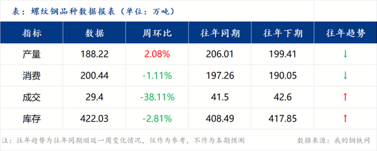 我的鋼鐵網(wǎng):2025年12月29日-2026年1月2日,全國螺紋鋼均價為3324元/噸,周環(huán)比上漲0.24%。供應端,螺紋鋼周產(chǎn)量188.22萬噸,庫存422.03萬噸;需求端,消費量200.44萬噸,建材周度成交量29.4萬噸。