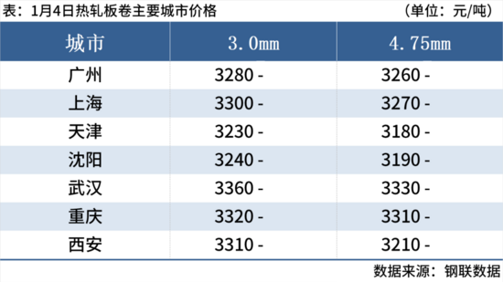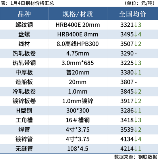 熱軋板卷:1月日,全國(guó)24個(gè)主要城市4.75mm熱軋板卷均價(jià)3290元/噸,較上一交易日持平。發(fā)改委明確新年“兩新”政策的支持范圍、補(bǔ)貼標(biāo)準(zhǔn)和工作要求,宏觀托底產(chǎn)業(yè),但短期作用稍弱。其次產(chǎn)業(yè)端庫(kù)存下降,需求表現(xiàn)弱勢(shì),1月鋼廠復(fù)產(chǎn)情況較多,同時(shí)下游現(xiàn)貨成交清淡,現(xiàn)貨價(jià)格仍承壓?;久婕敖谫Q(mào)易商情緒波動(dòng)幅度有限,整體維持謹(jǐn)慎交易氣氛,市價(jià)難見太大波動(dòng),多呈現(xiàn)小幅盤整觀望的行情。預(yù)計(jì)5日全國(guó)熱軋板卷價(jià)格窄幅調(diào)整。