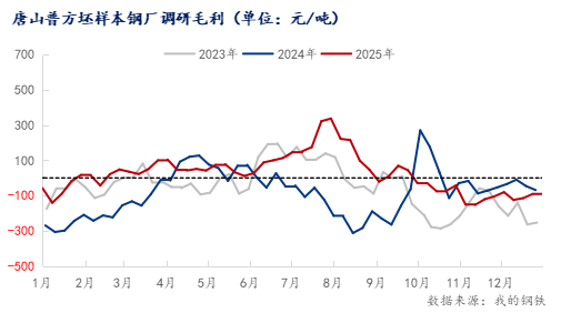 本周唐山主流樣本鋼廠平均鐵水不含稅成本為2269元/噸,平均鋼坯含稅成本3029元/噸,周環(huán)比下調(diào)12元/噸,與1月4日當(dāng)前普方坯出廠價(jià)格2930元/噸相比,鋼廠平均虧損111元/噸。