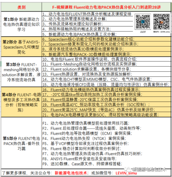 新能源電池包技術(shù) 公眾號(hào)特惠,為方便大家提升,限量50份半價(jià)出售全套《新能源電池包PACK設(shè)計(jì)入門到進(jìn)階26講》、《Fluent新能源電池包PACK熱管理仿真入門到進(jìn)階28講+番外篇》視頻課程,并送持續(xù)答疑!了解更多課程,加微信號(hào)詳詢:LEVIN_simu