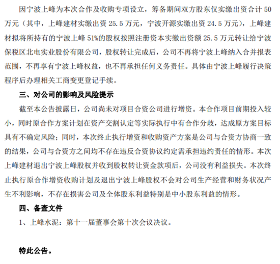 因?qū)幉ㄉ戏鍨楸敬魏献骷笆召?gòu)專項(xiàng)設(shè)立,籌備期間雙方股東僅實(shí)繳出資合計(jì)50萬(wàn)元(其中,上峰建材實(shí)繳出資25.5萬(wàn)元,寧波開(kāi)源實(shí)繳出資24.5萬(wàn)元),上峰建材擬將所持有的寧波上峰51%的股權(quán)按照注冊(cè)資本實(shí)繳出資額25.5萬(wàn)元轉(zhuǎn)讓給寧波保稅區(qū)北電實(shí)業(yè)股份有限公司,股權(quán)轉(zhuǎn)讓完成后,公司不再將寧波上峰納入合并報(bào)表范圍,不再享有寧波上峰權(quán)益,也不再承擔(dān)任何義務(wù)責(zé)任。具體由寧波上峰履行決策程序后辦理相關(guān)工商變更登記手續(xù)。