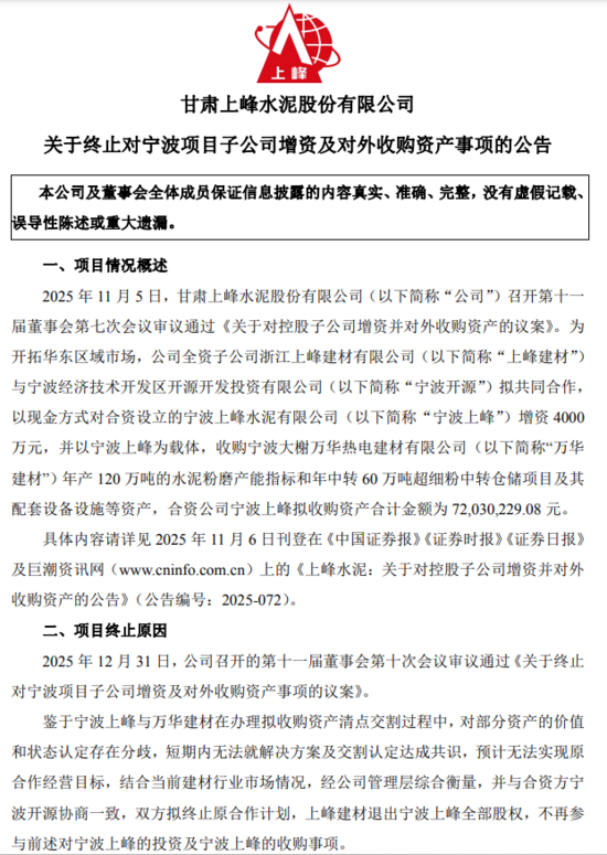 日前,上峰水泥發(fā)布《關(guān)于終止對(duì)寧波項(xiàng)目子公司增資及對(duì)外收購(gòu)資產(chǎn)事項(xiàng)的公告》顯示,公司召開(kāi)的第十一屆董事會(huì)第十次會(huì)議審議通過(guò)《關(guān)于終止對(duì)寧波項(xiàng)目子公司增資及對(duì)外收購(gòu)資產(chǎn)事項(xiàng)的議案》。鑒于寧波上峰與萬(wàn)華建材在辦理擬收購(gòu)資產(chǎn)清點(diǎn)交割過(guò)程中,對(duì)部分資產(chǎn)的價(jià)值和狀態(tài)認(rèn)定存在分歧,短期內(nèi)無(wú)法就解決方案及交割認(rèn)定達(dá)成共識(shí),預(yù)計(jì)無(wú)法實(shí)現(xiàn)原合作經(jīng)營(yíng)目標(biāo),結(jié)合當(dāng)前建材行業(yè)市場(chǎng)情況,經(jīng)公司管理層綜合衡量,并與合資方寧波開(kāi)源協(xié)商一致,雙方擬終止原合作計(jì)劃,上峰建材退出寧波上峰全部股權(quán),不再參與前述對(duì)寧波上峰的投資及寧波上峰的收購(gòu)事項(xiàng)。
