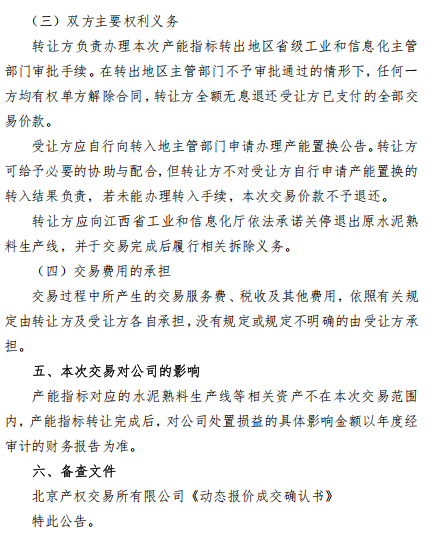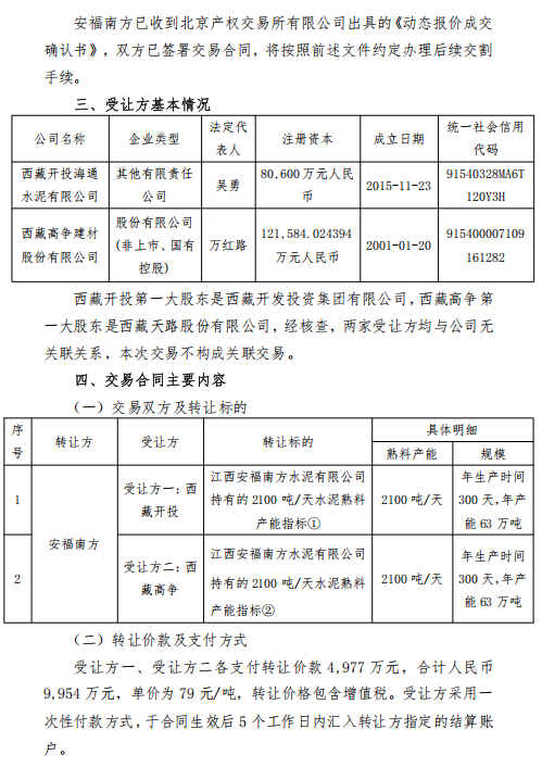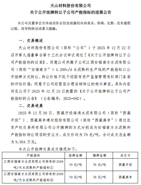 2026年1月4日,天山材料股份有限公司發(fā)布《關(guān)于公開掛牌轉(zhuǎn)讓子公司產(chǎn)能指標(biāo)的進(jìn)展公告》顯示,2025年12月30日,西藏開投海通水泥有限公司(簡(jiǎn)稱“西藏開投”)、西藏高爭(zhēng)建材股份有限公司(簡(jiǎn)稱“西藏高爭(zhēng)”)通過(guò)北京產(chǎn)權(quán)交易所有限公司公開摘牌的方式分別成為江西安福南方水泥有限公司熟料產(chǎn)能指標(biāo)轉(zhuǎn)讓項(xiàng)目的受讓方,成交價(jià)均為79元/噸,合計(jì)成交總金額為9,954萬(wàn)元