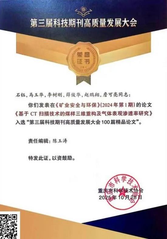 《礦業(yè)安全與環(huán)?!?篇論文入選“第三屆科技期刊高質(zhì)量發(fā)展大會(huì)”百篇精品論文;2篇論文入選重慶市期刊高質(zhì)量發(fā)展案例庫(kù)。