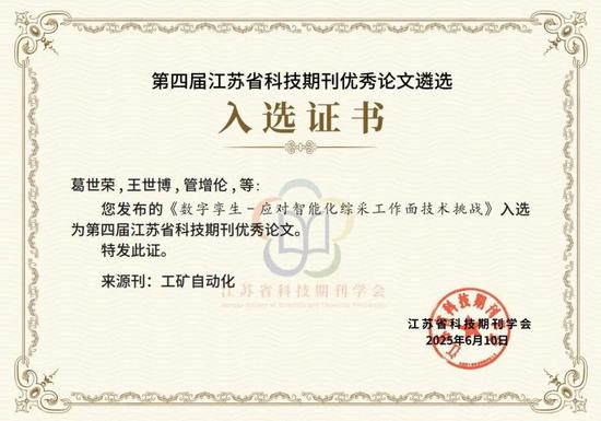《工礦自動(dòng)化》1篇論文入選“第四屆江蘇省科技期刊優(yōu)秀論文”。