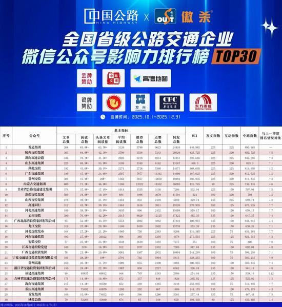 全國省級公路交通企業(yè)二級公司微信公眾號影響力榜單(2025年第四季度),點(diǎn)擊查看高清大圖