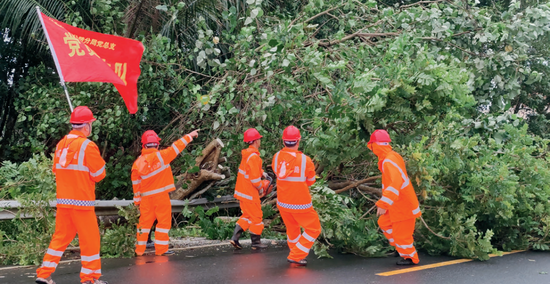 ▲海南省公路管理局黨員先鋒隊正在開展應(yīng)急搶險