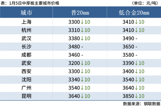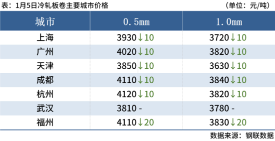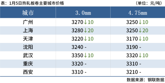 熱軋板卷:1月5日,全國(guó)24個(gè)主要城市4.75mm熱軋板卷均價(jià)3283元/噸,較上一交易日價(jià)格下跌7元/噸?,F(xiàn)貨市場(chǎng)價(jià)格小幅下跌,終端觀望情緒較濃,備貨意愿較低,整體成交偏弱。隨著傳統(tǒng)消費(fèi)淡季深入,氣溫逐步下降,下游開工情況轉(zhuǎn)弱,終端需求下滑,供需結(jié)構(gòu)轉(zhuǎn)弱,且海外形勢(shì)不穩(wěn)定性增加,市場(chǎng)整體維持謹(jǐn)慎偏弱態(tài)勢(shì)。綜合來看,預(yù)計(jì)6日熱軋板卷價(jià)格或弱勢(shì)震蕩運(yùn)行