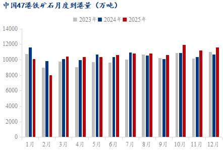 展望1月,中國(guó)鐵礦石供需面或仍將表現(xiàn)為供應(yīng)過(guò)剩。供應(yīng)端,1月鐵礦石日均發(fā)運(yùn)量預(yù)計(jì)季節(jié)性下滑,環(huán)比減少,同比增加;綜合前期發(fā)運(yùn)、海漂庫(kù)存及到港比例來(lái)看,47港到港量預(yù)計(jì)表現(xiàn)為環(huán)比小幅增加,同比增加。
