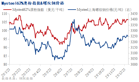 截至12月31日,Mysteel62%澳粉遠(yuǎn)期價(jià)格指數(shù)106.5美元/噸,環(huán)比上漲1.8美元/噸,漲幅1.72%。上海螺紋鋼價(jià)格3252元/噸,環(huán)比上漲65元/噸,漲幅2.04%。