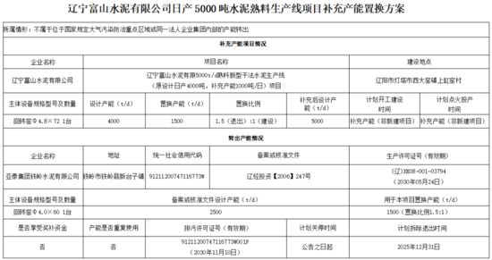 根據(jù)通告,遼寧富山水泥有限5000t/d熟料新型干法水泥生產(chǎn)線(xiàn)原設(shè)計(jì)產(chǎn)能4000t/d,置換產(chǎn)能1500t/d,置換比例為1.5:1。亞泰集團(tuán)鐵嶺水泥有限公司一條2500t/d水泥熟料線(xiàn)中的1500t/d用于本項(xiàng)目置換產(chǎn)能。
