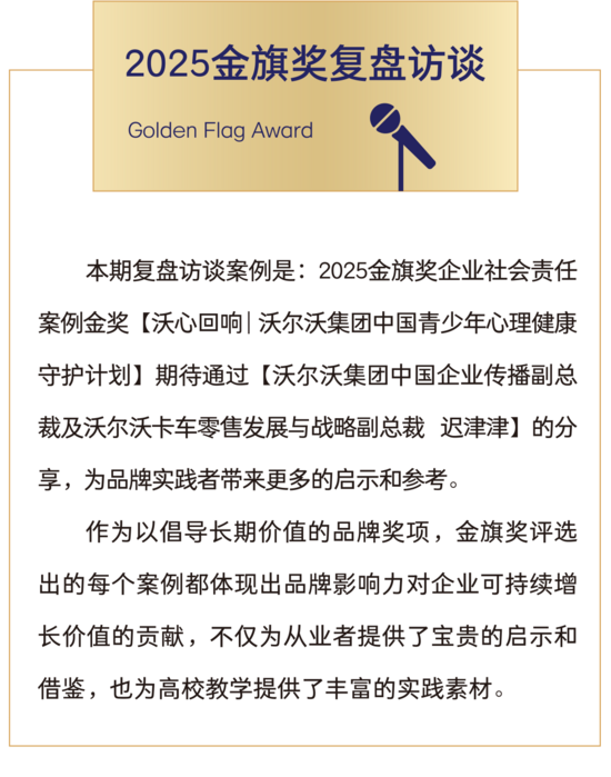 在此背景下,沃爾沃集團(tuán)中國(guó)發(fā)起“沃心回響——青少年心理健康守護(hù)計(jì)劃”,以“以人為本”的可持續(xù)發(fā)展理念為核心,構(gòu)建學(xué)校-企業(yè)-社會(huì)三位一體教育支持網(wǎng)絡(luò),用專業(yè)力量與創(chuàng)新模式為青少年心理健康保駕護(hù)航,該項(xiàng)目也榮獲2025金旗獎(jiǎng)企業(yè)社會(huì)責(zé)任案例金獎(jiǎng)。