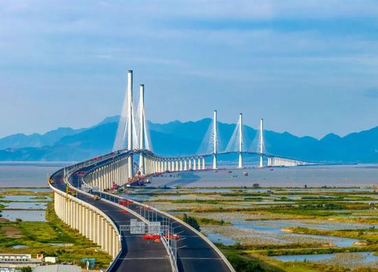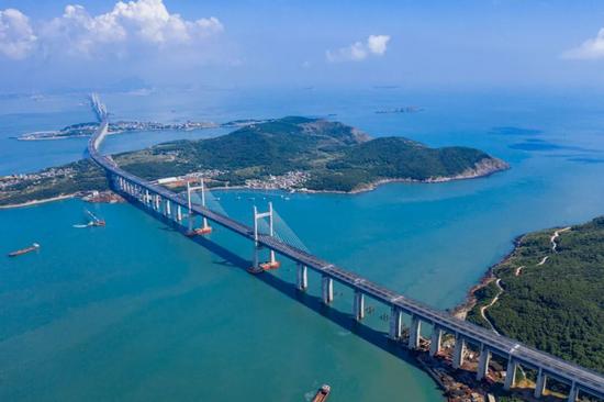 黃茅海跨海通道2024年底通車后,廣東珠海至江門的陸路通行時間縮短至30分鐘左右。黃茅海大橋建成時是世界跨徑最大的三塔斜拉公路橋。馮珠仔攝