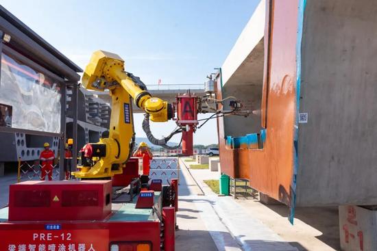 梁端智能噴涂機(jī)器人,單片箱梁預(yù)制可節(jié)約噴涂時間1.5小時。王 昊攝