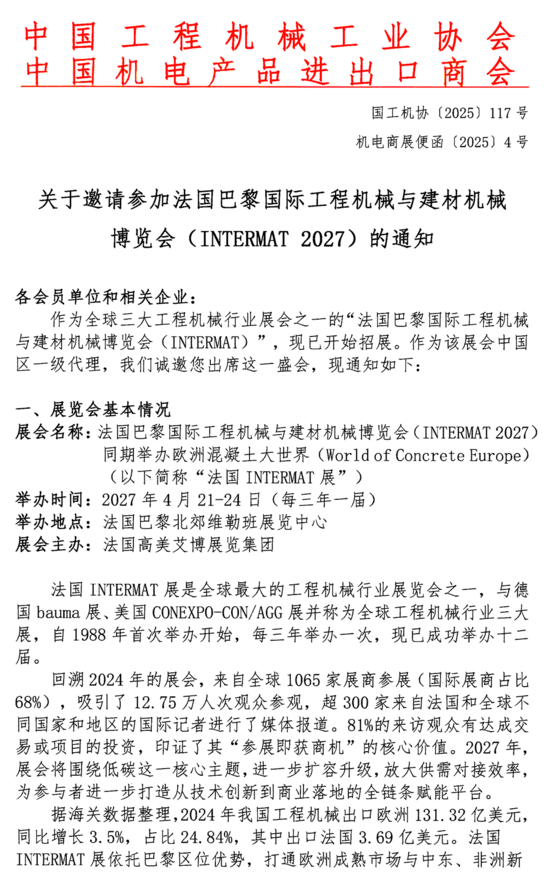 作為全球三大工程機(jī)械行業(yè)展會(huì)之一的“法國(guó)巴黎國(guó)際工程機(jī)械與建材機(jī)械博覽會(huì)(INTERMAT)”,現(xiàn)已開(kāi)始招展。作為該展會(huì)中國(guó)區(qū)一級(jí)代理,我們誠(chéng)邀您出席這一盛會(huì),現(xiàn)通知如下:
