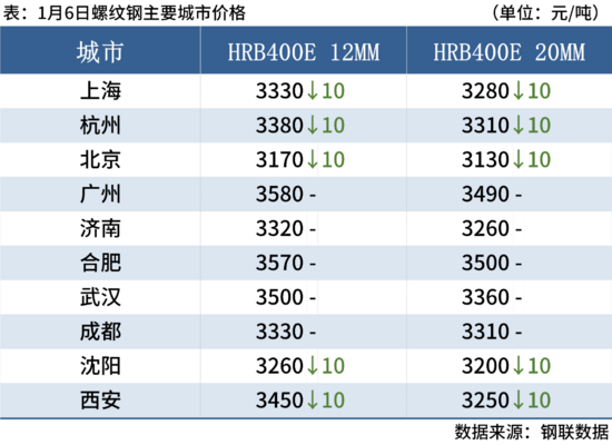 螺紋鋼1月6日,全國31個主要城市20mm三級抗震螺紋鋼均價3308元/噸,較上個交易日元/噸。目前市場仍處于供需雙弱格局,市場觀望心態(tài)變濃,預(yù)計7日國內(nèi)建筑鋼材價格或?qū)⒕S持震蕩偏弱運行態(tài)勢。