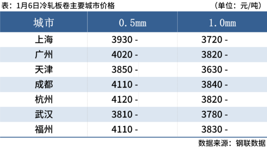 冷軋板卷1月6日,全國24個主要城市1.0mm冷卷均價3833元/噸,較上個交易日4元/噸。隨著春節(jié)臨近,終端采購需求正進入季節(jié)性、趨勢性下滑通道,需求預(yù)期減弱使得貿(mào)易商訂貨意愿低迷,鋼廠新訂單承接不理想。據(jù)了解,1月份鋼廠訂單普遍存在缺口,需依靠優(yōu)惠政策才勉強接滿;對2月份的接單預(yù)期也維持謹慎,預(yù)計將與1月低位持平,部分鋼廠已提前出臺政策,開始承接2-3月份的遠期訂單。綜合來看,預(yù)計日冷軋板卷價格或?qū)⒄鹗庍\行。