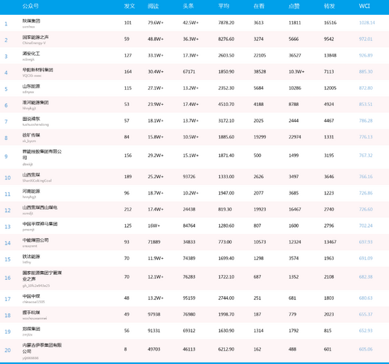 中國煤炭企業(yè)微信公眾號影響力榜單