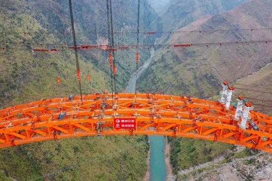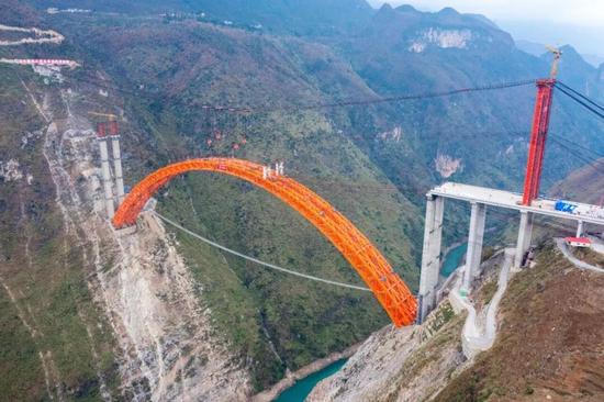 自2025年6月14日啟動首節(jié)段吊裝以來,項目團隊相繼克服了作業(yè)空間受限、構件吊裝精度要求嚴苛、極端天氣頻發(fā)等困難。針對主拱圈最大吊裝節(jié)段重約290噸的挑戰(zhàn),團隊在運用自主研發(fā)智慧纜吊系統(tǒng)的基礎上,首創(chuàng)吊裝軌跡精準控制技術,為節(jié)段吊裝提供“智能導航”,確保沿最優(yōu)路徑平穩(wěn)、精準就位,保障了全過程吊裝安全。歷經(jīng)6個月持續(xù)攻堅與88個節(jié)段精準對接,這座超級工程最終在云端之上完成了壯麗的“描紅”之作。