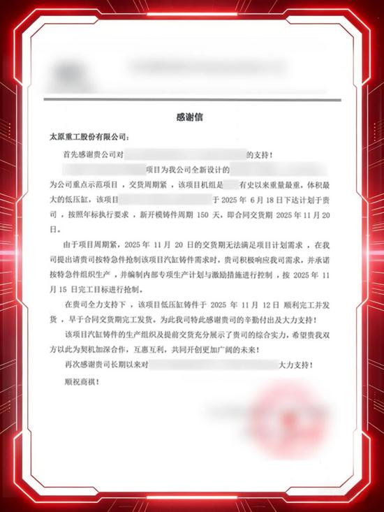 近日,太重鑄鍛件事業(yè)部收到了一封來自用戶的感謝信。信中對(duì)事業(yè)部團(tuán)隊(duì)的專業(yè)能力與負(fù)責(zé)精神給予高度贊揚(yáng),字里行間透露著信賴與認(rèn)可。