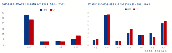從東北建材資源南下整體情況來看,2026年1月東北螺紋南下計劃量為38萬噸,同比減少4.5萬噸、環(huán)比減少1.4萬噸,盤線南下計劃量24.6萬噸,同比減少2.2萬噸、環(huán)比增加1萬噸。2025年12月東北螺紋南下實發(fā)量為39.4萬噸、較計劃量減少4.6萬噸,同比減少6.7萬噸、環(huán)比減少2.5萬噸;盤線南下實發(fā)量23.6萬噸、較計劃減少7.4萬噸,同比減少8.3萬噸、環(huán)比增加0.3萬噸。