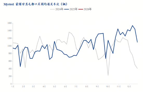 從基本面來看,主產(chǎn)地煤礦結(jié)束年底元旦假期檢修之后,多數(shù)前期停產(chǎn)煤礦已在3號左右全面復(fù)產(chǎn),產(chǎn)量基本恢復(fù)滿產(chǎn)水平,但仍有部分受制于地質(zhì)條件影響仍在停產(chǎn)煤礦預(yù)計要到春節(jié)假期結(jié)束后復(fù)產(chǎn),1月產(chǎn)量環(huán)比12月預(yù)計回升,我網(wǎng)統(tǒng)計1月1日至5日有49座煤礦復(fù)產(chǎn),涉及產(chǎn)能7505萬噸。不過2026年產(chǎn)量高峰期預(yù)計將在3月實現(xiàn)。蒙煤方面,由于12月份未完成沖量任務(wù),元旦前蒙煤通關(guān)持續(xù)高位,元旦假期之后,由于任務(wù)減輕及庫容限制,通關(guān)車數(shù)明顯下滑,目前甘其毛都通關(guān)車數(shù)已降至1100車左右。