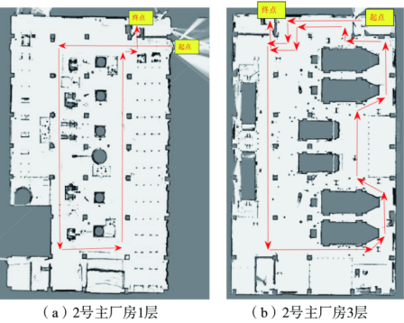 (1)在測試路線中選擇用于定位測試的關(guān)鍵點(diǎn)位,1~6層共111個(gè)測試點(diǎn)位。其中1層和3層關(guān)鍵點(diǎn)位標(biāo)識如圖13所示,記錄所有測試點(diǎn)位的實(shí)際位置坐標(biāo)。